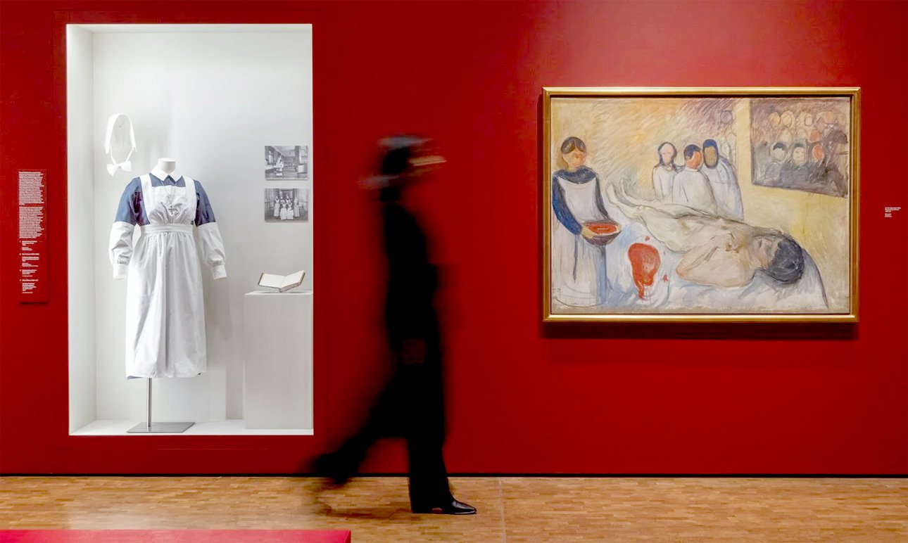 Эдвард Мунк всю жизнь боялся легочных, психических и венерических заболеваний и много времени проводил в лечебных учреждениях и санаториях. Камертоном выставки стала картина «На операционном столе» (1902–1903) с обнаженным телом, фигурой медсестры и ярким пятном крови на первом плане. Толчком к ее созданию, вероятно, послужила история с пальцем художника, простреленным после бурного расставания с невестой, Туллой Ларсен. Рядом с картиной — рентгеновский снимок кисти руки Мунка с застрявшей пулей. Тот же прием использован не раз. Так, около «Автопортрета после испанки» (1919) показан кислородный аппарат (очень передовой для того времени).