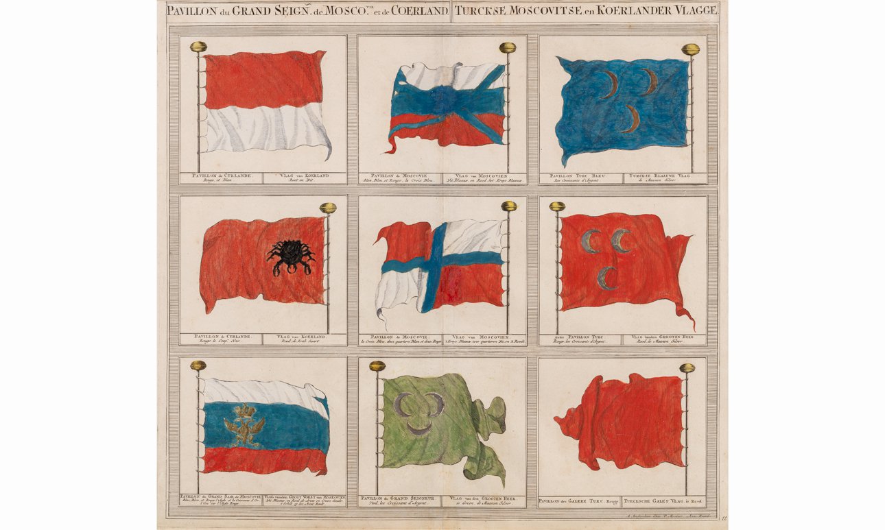 Лист, который я не стал отдавать в экспозицию, так как он не относится к ее теме — училища. Зато он иллюстрирует историю русского флота в целом. Я приобрел его из собрания Андрея Кусакина. На самом деле этот лист — загадка. Это «Карта морских флагов» Ромейна де Хоге 1693 года, где среди девяти флагов изображены три российских, в том числе Андреевский на триколоре. Но это ведь на шесть лет раньше официальной даты его учреждения и первого известного наброска рукой Петра! А здесь он уже в цветном варианте присутствует. Это удивительно. В 1693 году у Петра была еще только «потешная» флотилия на озере. Этот лист, я надеюсь, дождется своего научного исследования и серьезных публикаций, которые сдвинут дату рождения Андреевского флага чуть в глубь времен. Это ведь такой важный символ, а я смог найти неизвестную ранее веху в его создании!