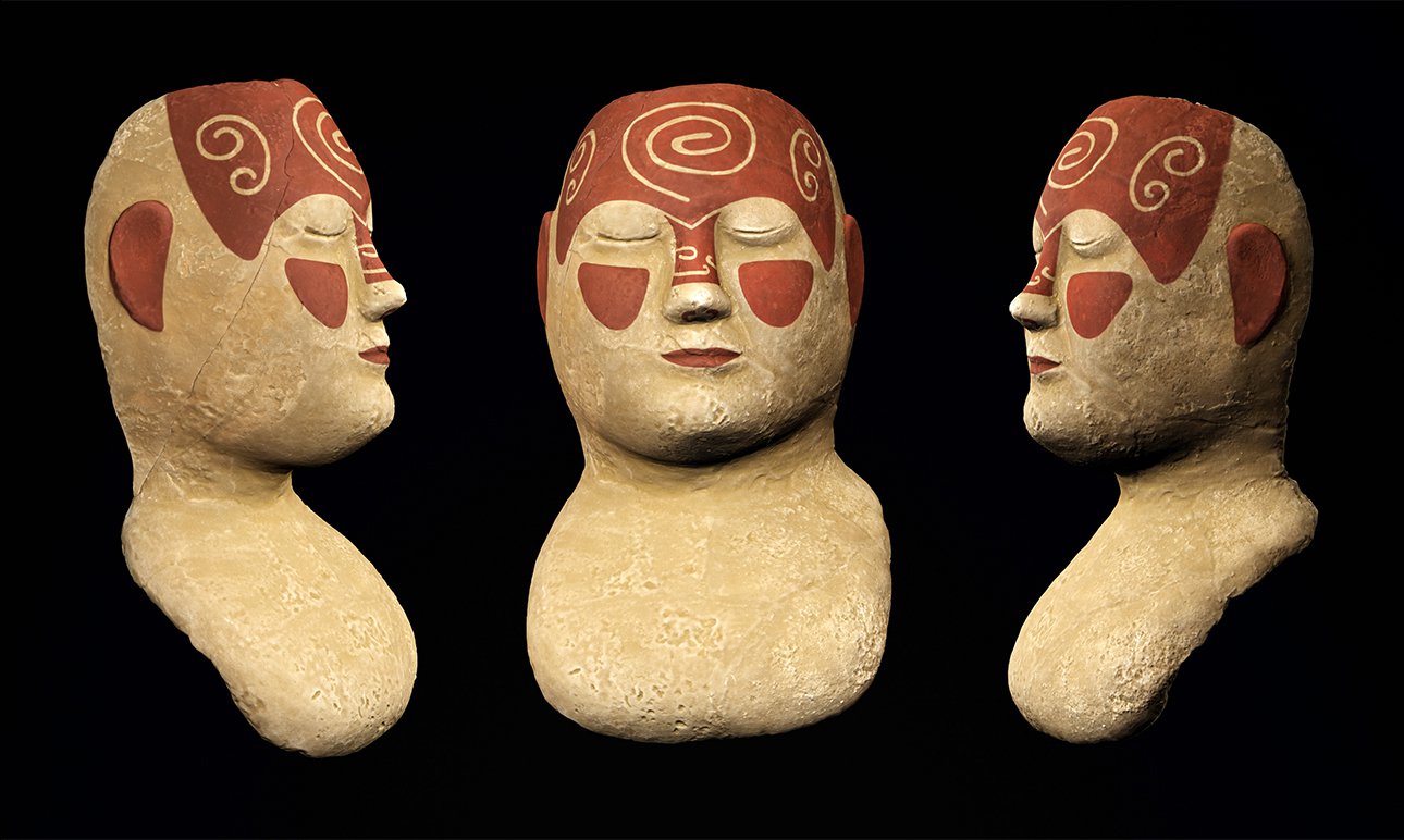 Маска с небольшой утратой в лобной части, выбранная для опробования процедуры, была отснята в Центре иммерсивных технологий методами 3D-сканирования. Сотрудники ГИМ, археологи Кирилл Фирсов и Галина Камелина, занимались научным наполнением проекта. Опираясь на исследования археологов и изучив технологию изготовления этих артефактов, компьютерные специалисты сначала виртуально восстановили утраченный фрагмент головы, а затем сделали реконструкцию первозданной раскраски. Реконструкция выполнена с применением искусственного интеллекта и цифровой реставрации. Полученный бело-красный вариант — предполагаемый: белый гипс не только потемнел со временем, но и обжигался когда-то.