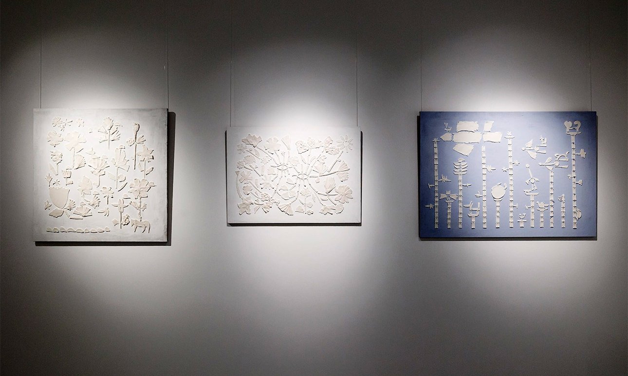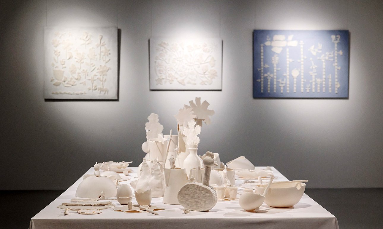«Идея перевода объемных предметов в плоскостные пришла после того, как абсолютно случайно среди обрезков раскатанной фарфоровой массы я увидела три спонтанно образовавшихся элемента, которые вместе работали как образ птицы. Два крыла и основание. Так начали возникать орнаментальные фарфоровые истории, которые легли в основу каждого произведения», — рассказывает художница. Образ птицы стал центральным и объединяющим для всей выставки, и внимательный зритель сможет разглядеть его повсюду — от мозаик до сервировки стола-инсталляции.