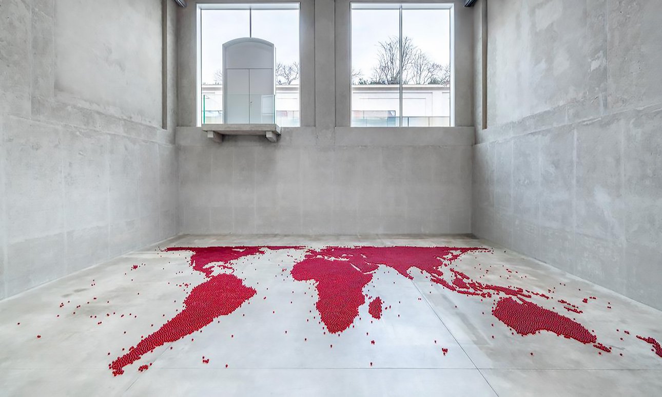 Бетонный пол в центральном зале покрыт скоплениями полупрозрачных красных стеклянных шаров, расположенных в форме карты мира. Политические и географические границы здесь намеренно игнорируются, обозначены только континенты. Более 30 тыс. стеклянных шаров, не прикрепленных к полу, образуют неустойчивую конфигурацию, которую художница описывает как «свободную и неопределенную территорию», подверженную дестабилизирующим внешним воздействиям.