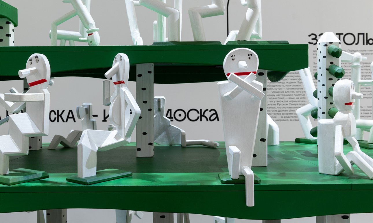Прежде чем оказаться на распутье, зритель увидит большущий стол с незримыми угощениями и более чем сотней трапезничающих деревянных фигурок. Это «Пир-гора» творческого союза «Планетянин» (Евгений Гриневич и Наталья Куликова). Этот мотив не просто так открывает — и закрывает — выставку: без застолья немыслимы ни рождение ребенка, ни женитьба, ни похороны. В отдельной витрине находятся «гости» пира из музейного собрания: барыня, щеголь, певица, гармонист и другие герои, выполненные дореволюционными и советскими резчиками по дереву.