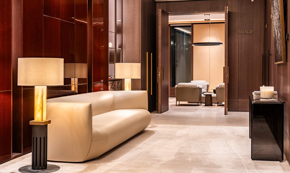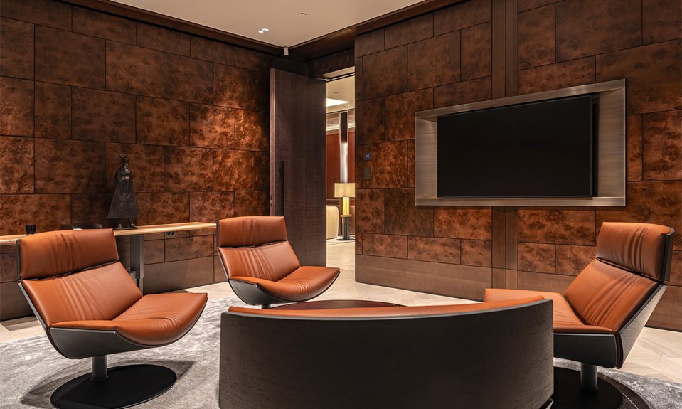 Проект нового пространства в Романовом переулке был разработан студией Андрея Зайцева ELFORMA. В основе архитектурного решения резиденции, площадь которой составила почти 800 кв. м, лежит яхтенная эстетика с ее высокими стандартами роскоши. Входная группа выполнена в форме палубы яхты; мотив поддерживают и оригинальные элементы, например спинки кресел в виде морских узлов. Интерьер оформлен в фирменных цветах MR Private: бежевый паркет из натурального дуба и плиты из мраморизованного известняка каменного оттенка гармонично сочетаются с лакированным шпоном красного дерева, а декоративные панели из темного дерева — с золотыми металлическими акцентами.
