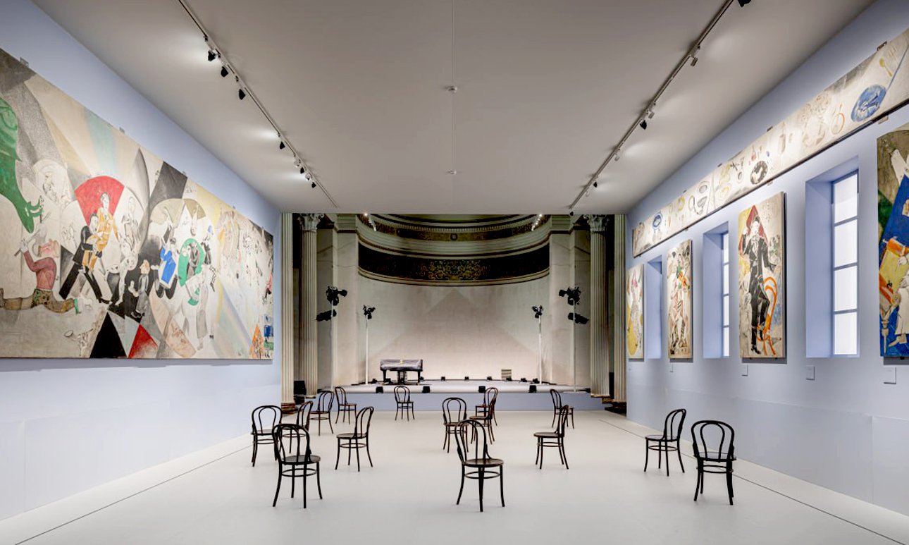 Центром экспозиции в Белом зале стала реконструкция зрительного зала Еврейского камерного театра, для которого художник в 1920 году расписал девять панно. Впервые широко представлен цикл рисунков, посвященных Первой мировой войне, — свидетельство того, как чутко художник реагировал на суровую реальность, окружившую его «сказочный» Витебск. Кроме того, посетители увидят иллюстрации Шагала к сказкам Дер Нистера и саму книгу, опубликованную лишь однажды, в 1917 году, на идише.